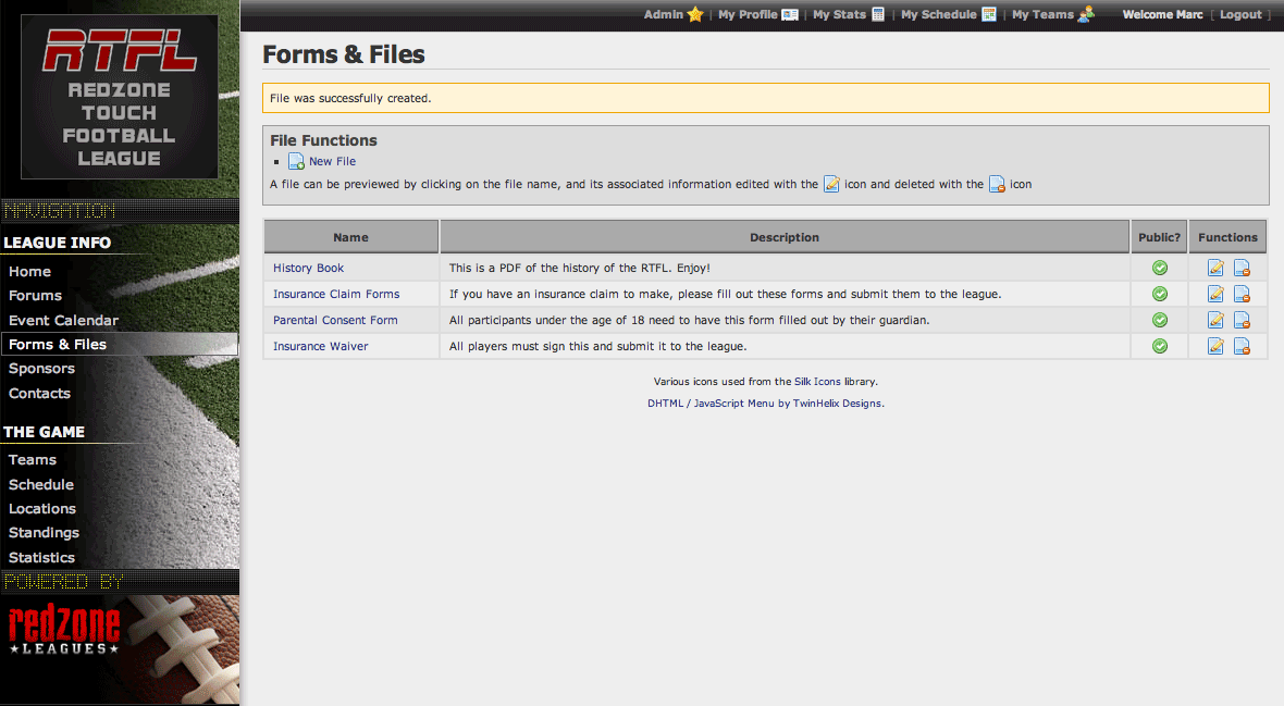 Redzone lets you manage a collection of files that are available for download so emailing out these types of things to your players is a thing of the past. Your files will always be in a common place and everybody will know where to find them.